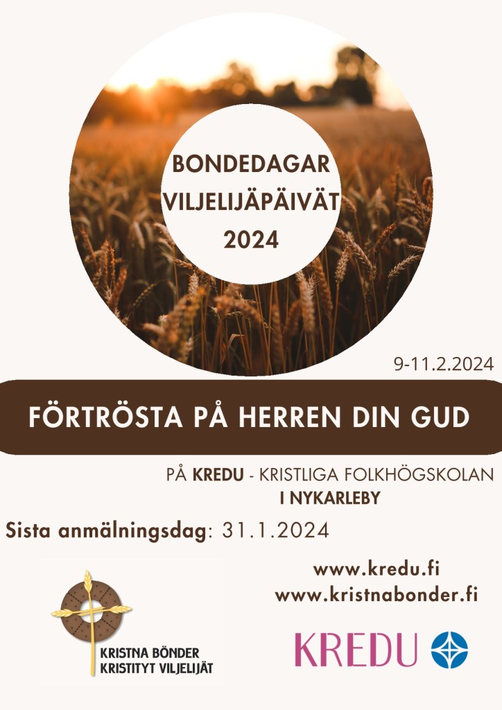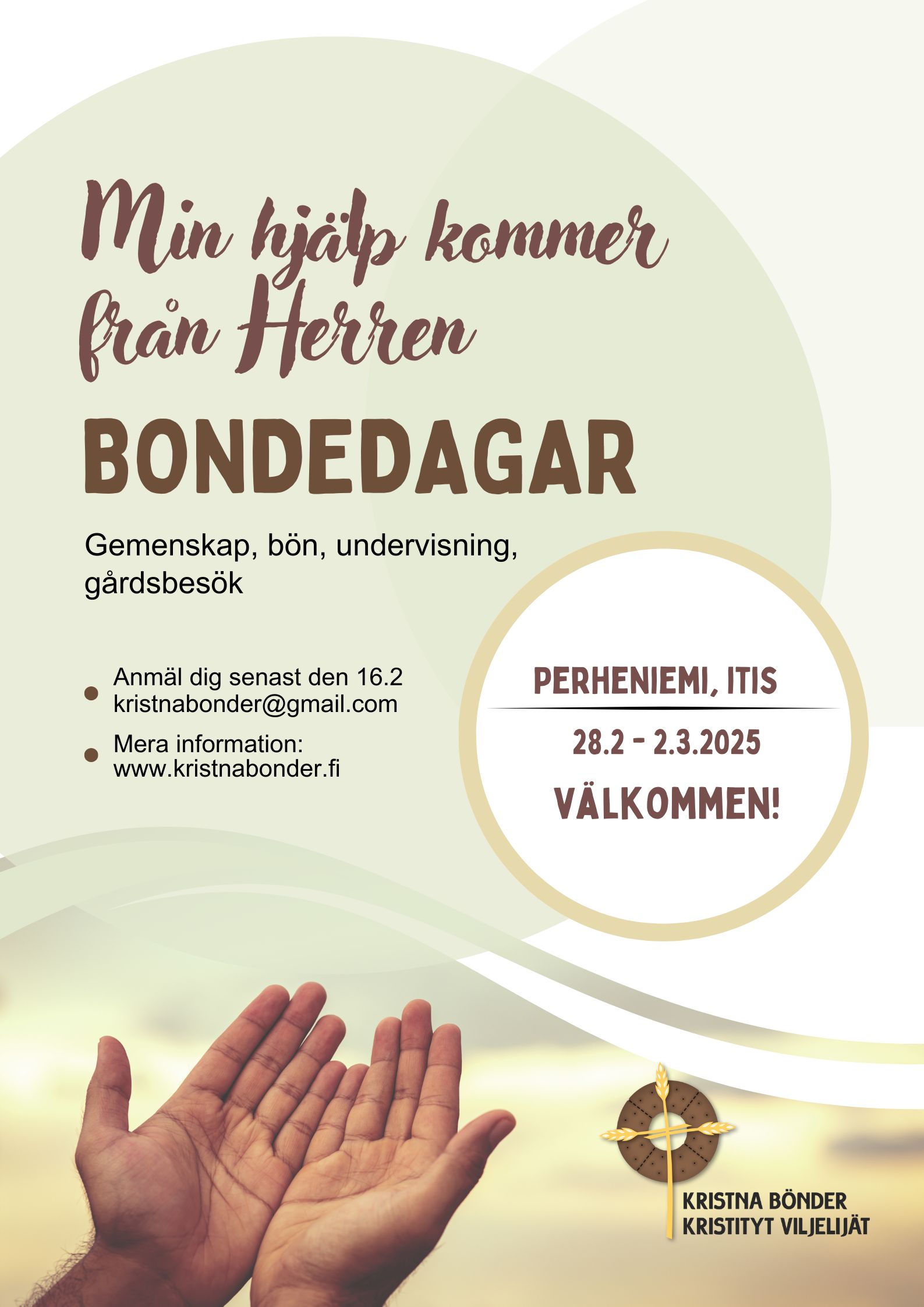 Kristna Bönders ”bondedagar” ordnades i år på kansanlähetysopisto i Ryttylä, Hausjärvi 10–12 februari 2023. Temat var ”Närmare Jesus”. I den turbulenta världen och vardagen är Jesus Kristus vår enda trygghet. Han ger oss en framtid och ett hopp och försäkrar oss om att vi inte behöver vara rädda, oberoende av omständigheterna.